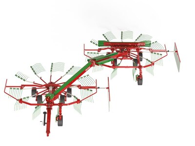 The ENODUO 780 model double rotor rake forms a central swath. The attachment to the tractor is pivoting semi-trailed. Hydraulically variable...