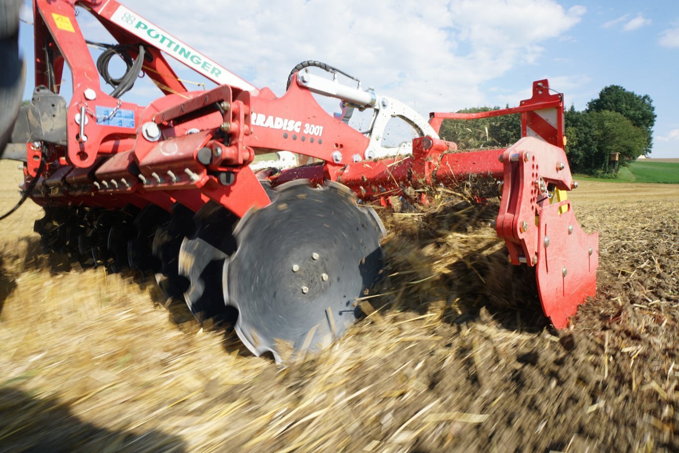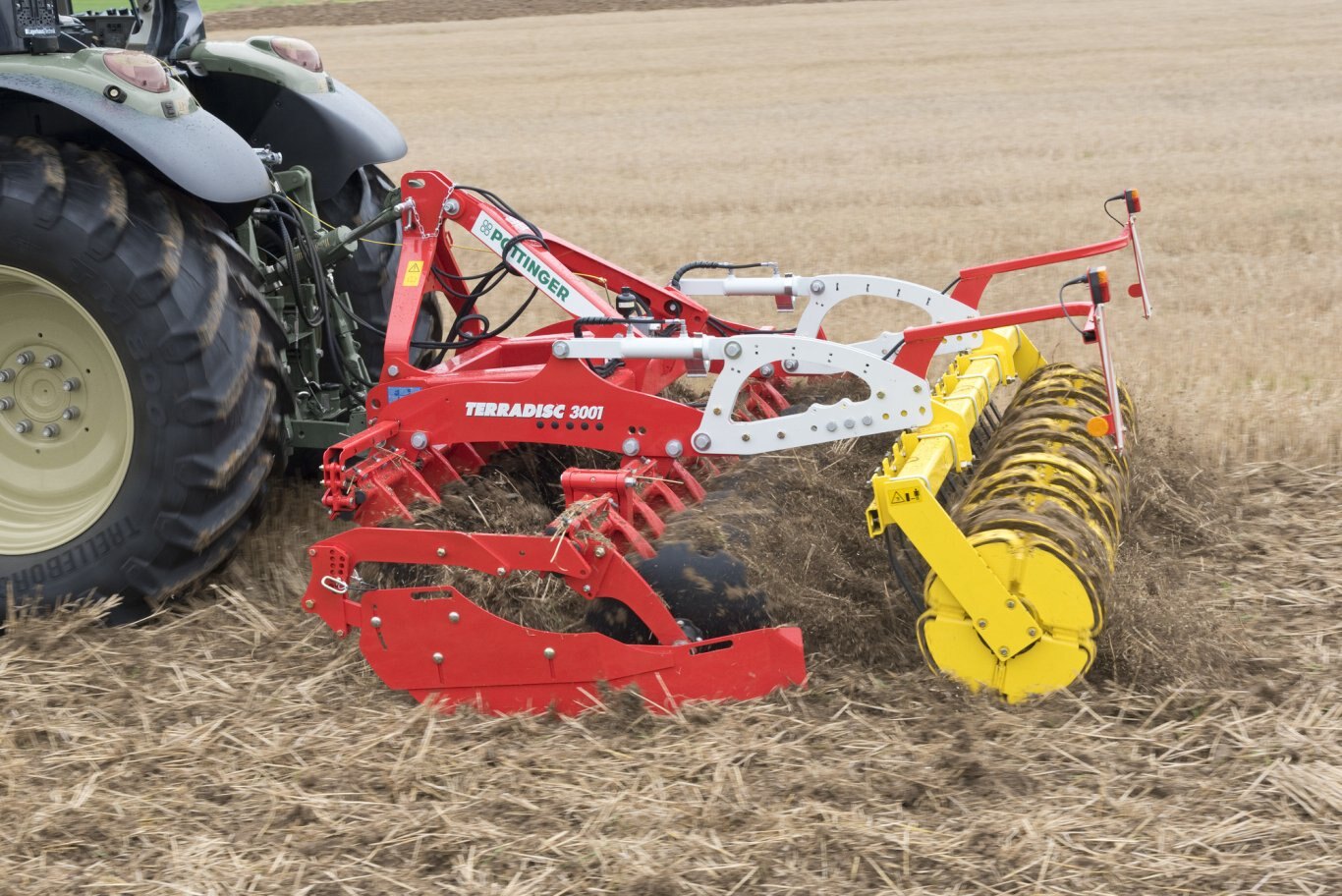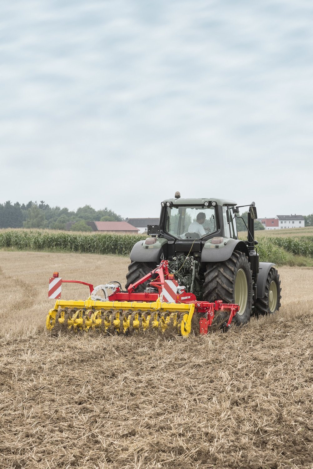 Compact design is a key feature of PÖTTINGER disc harrows. Working depths between 5 and 15 cm are possible. The offset configuration of the aggressively set discs mixes the harvest residues effectively into the soil.