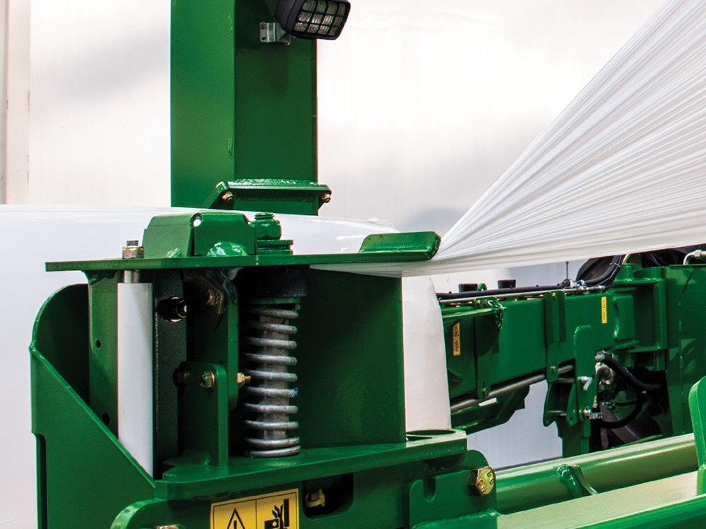 The 998 square bale wrapper is a high-output machine packed with features including a fully integrated, PTO driven, load sensing hydraulics system, conveyor loading with fast positioning of the square bale into the bale wrapping position, hydraulically operated cut & tie system, auto square bale levelling and a two point linkage mounted swivel headstock. It is equipped with two patents;