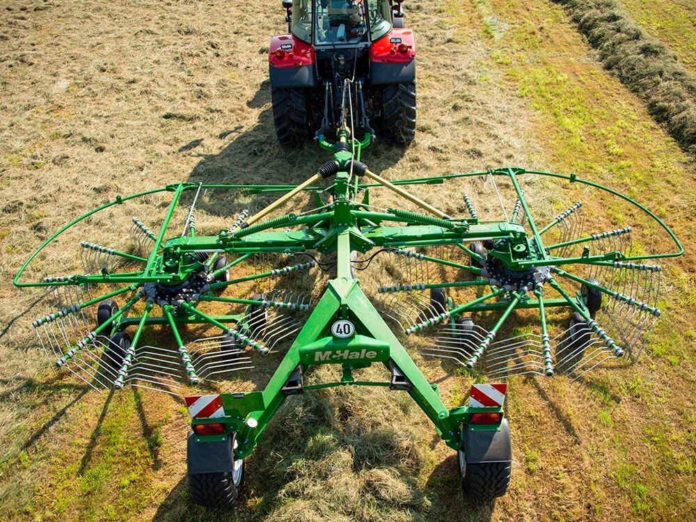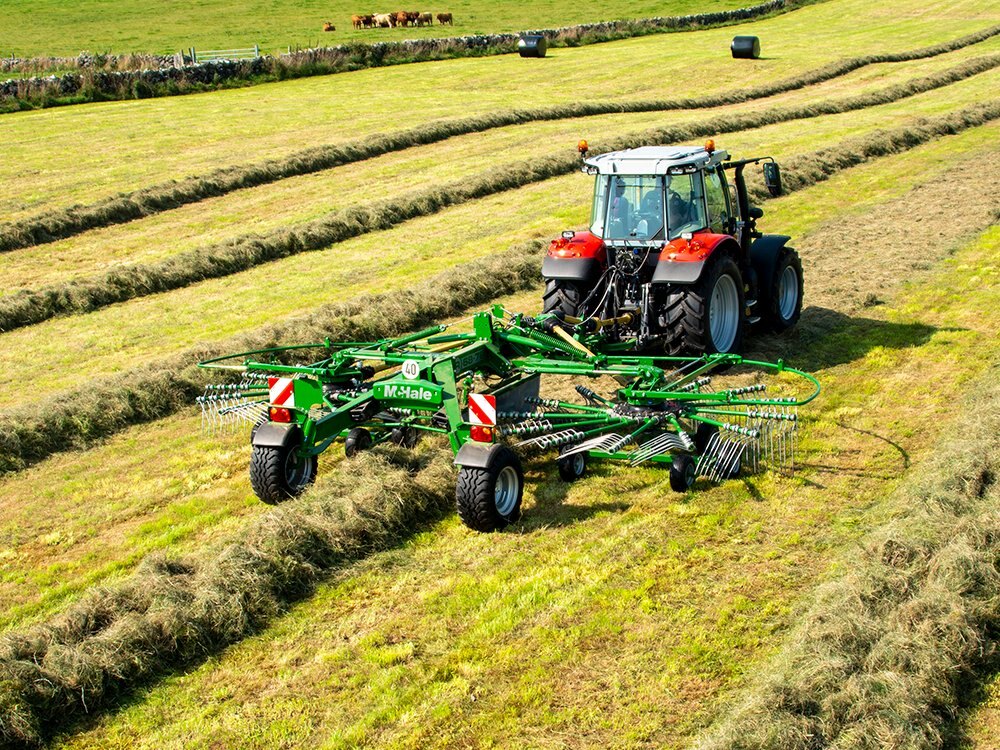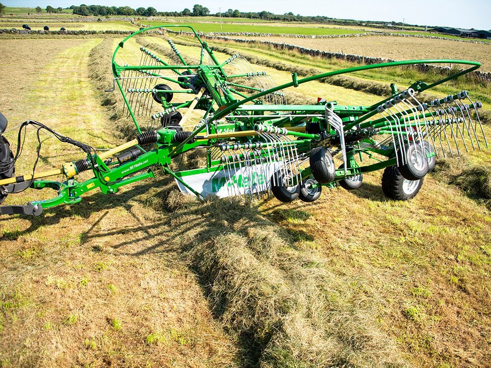 | The McHale R 68-78 can be used to combine multiple mower rows or to row up grass, which is left on the flat. McHale centre delivery rakes are powerful but gentle on the crop, delivering the perfect swath preparation. The rotors on the McHale centre delivery rakes are suspended centrally and both rotors operate at equal ground pressure across the adjustable working width to deliver the perfect swath. |