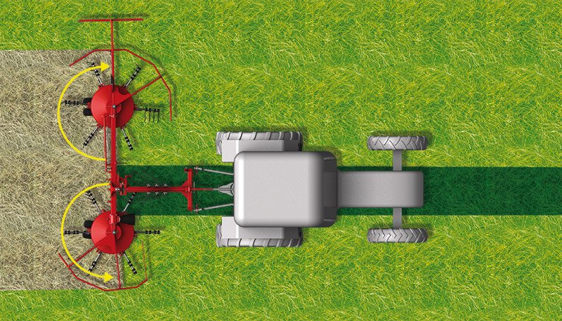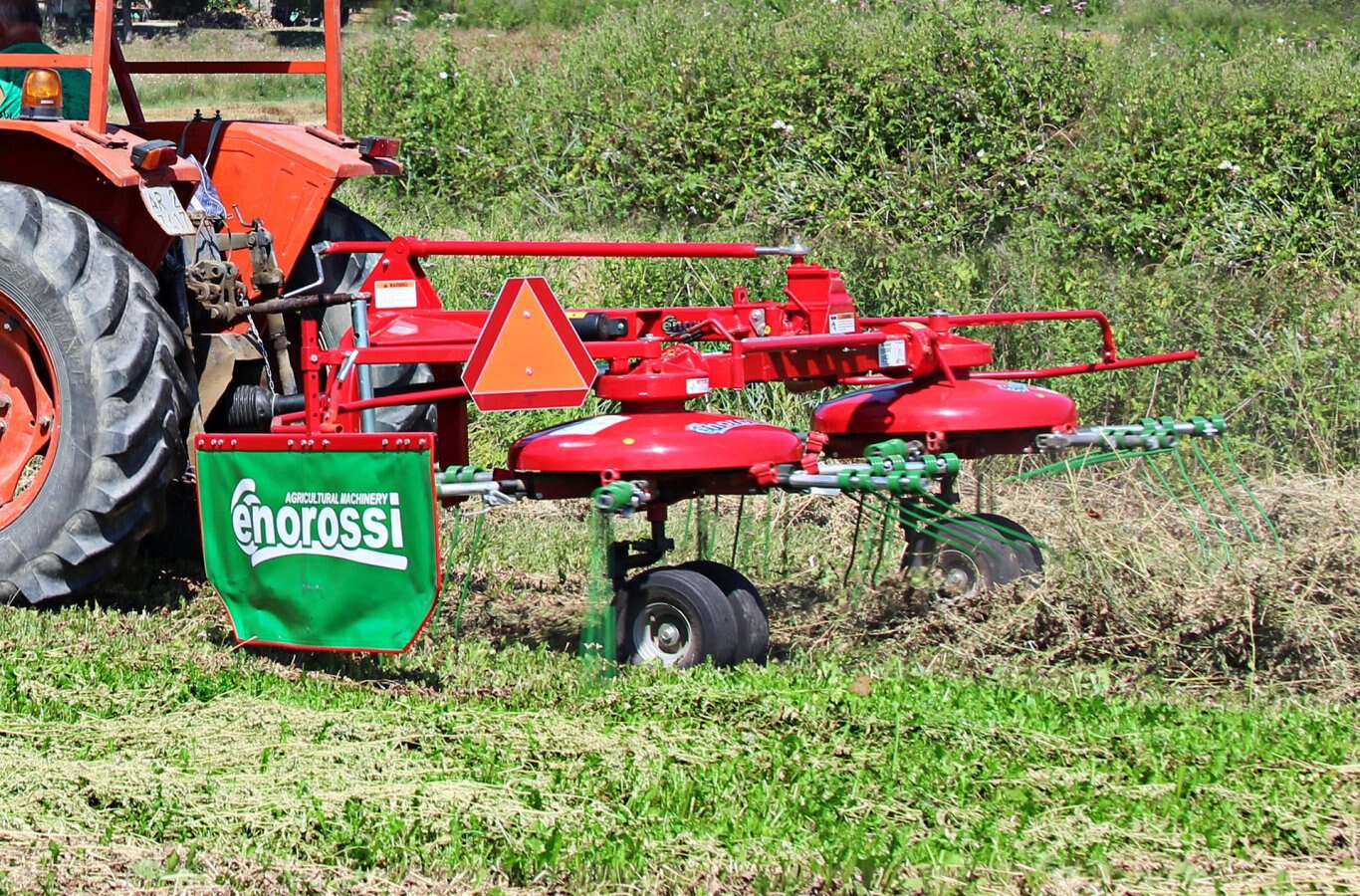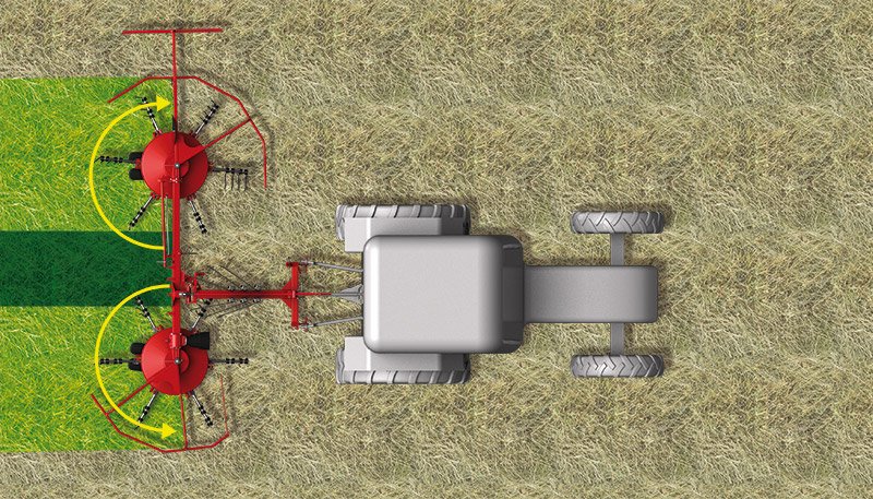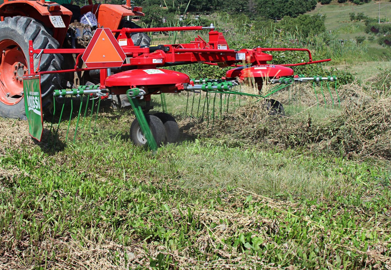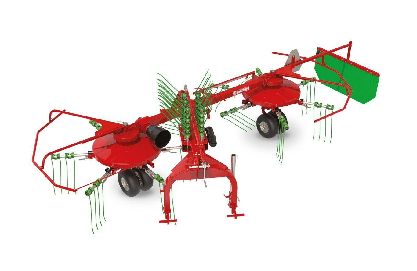 The double rotor tedder rake is an ideal machine for the most demanding haymakers and is suitable for medium to large farms.The machine is multi-purpose; it performs 4 functions: spreading, overturning, and forming the central and lateral swath. The adjustments to pass from a fuction to another are simple and quick. The DR 420 4R rake adapts to any working conditions even the most extreme.The machine is equipped as standard with twin pivoting tires which increase the stability in particular on rough terrains, and ensure that the machine follows the tractor’s movements. It is equipped as standard with a cardan shaft with slip clutch and a swath deflector.The working width can be adjusted by sliding the main frame from a minimum of 3.70 m to a maximum of 4.20 m.