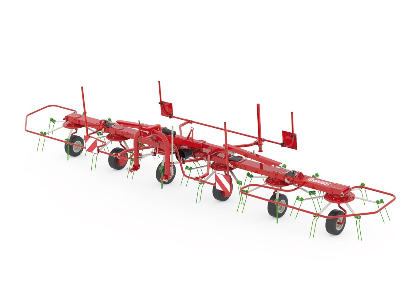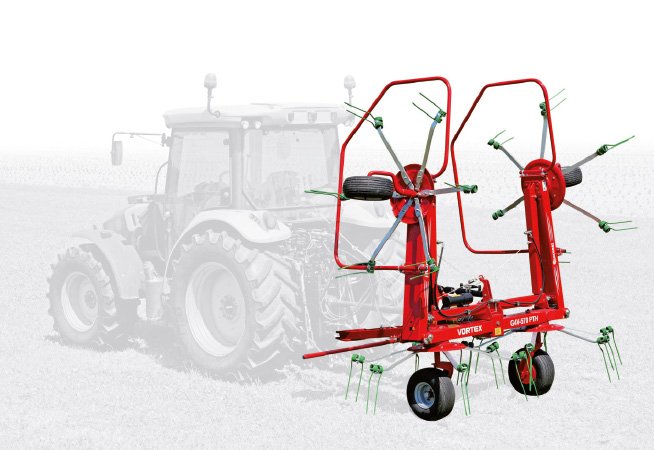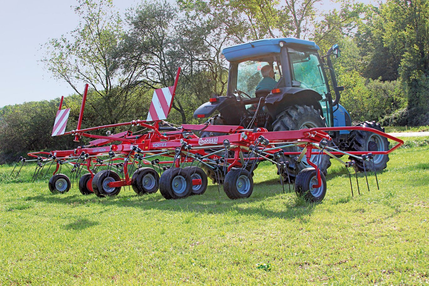 Tedder VORTEX G6 series with working width up to 7.45 m. Available in both mounted and pull type versions. Equipped with cardan shaft with safety clutch to protect the gearbox in case of overloads.