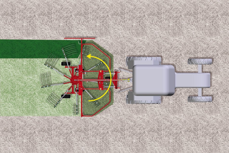 | The rotary rake RR 350-EVO 3 point version mounts spaced wheels on a tandem axle for greater stability. It is equipped with an articulated 3 point hitch with lateral oscillation and a locking pin for transport. The frame is equipped with lateral shock absorbers increasing the work efficiency. The arms are reinforced. |